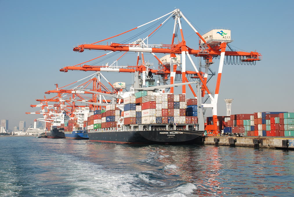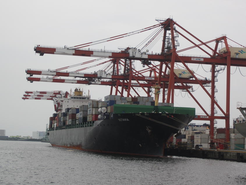 青海コンテナターミナル(東京港)に接岸するコンテナ船。