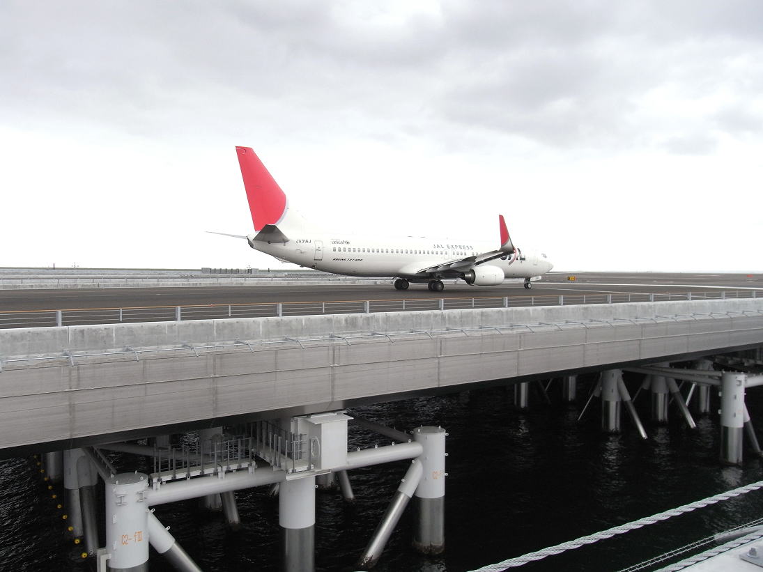羽田空港D滑走路上の旅客機。D滑走路は桟橋と埋立を組み合わせたハイブリッド構造です。