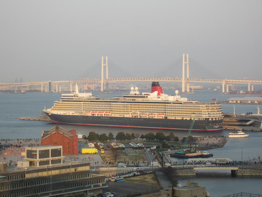 夕刻のクイーンエリザベス2世と横浜ベイブリッジ。手前は赤レンガ倉庫。(神奈川県横浜市)