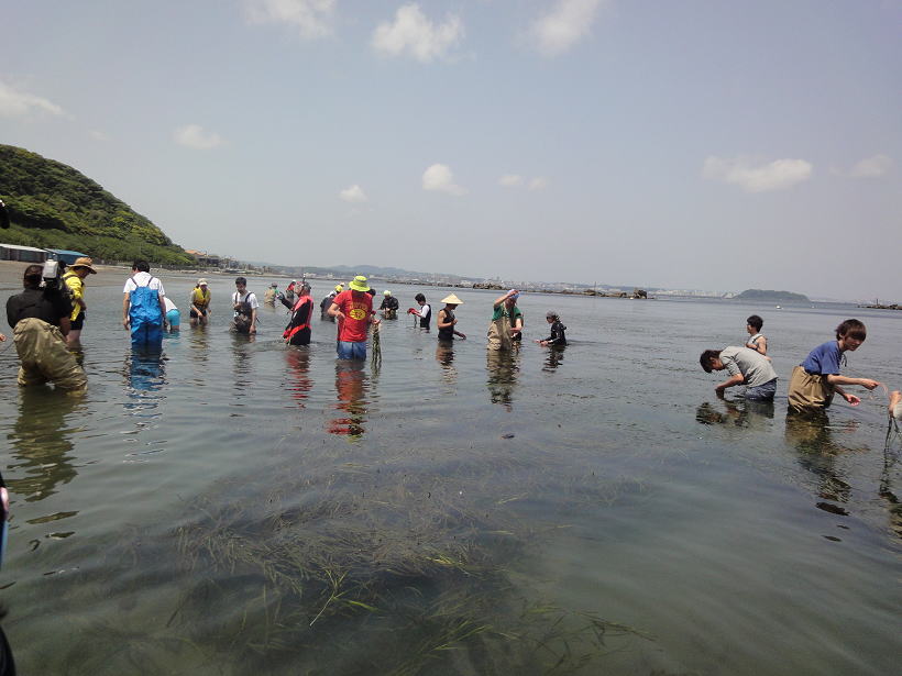 走水海岸におけるアマモの花枝採取。(神奈川県横須賀市)